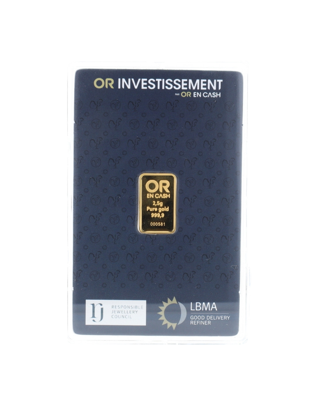 Facile à stocker, le lingot est vendu numéroté et conditionné sous blister plastique. Ce lingot est gravé avec une finition polie haute qualité, ce lingot mesure 19 x 11 mm, il est marqué Or en Cash. Le scellé comportant la certification LBMA sera accompagné d'une facture comportant le numéro du lingot.