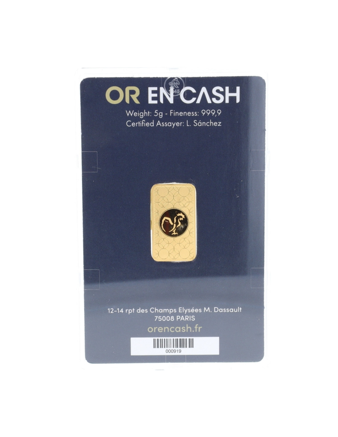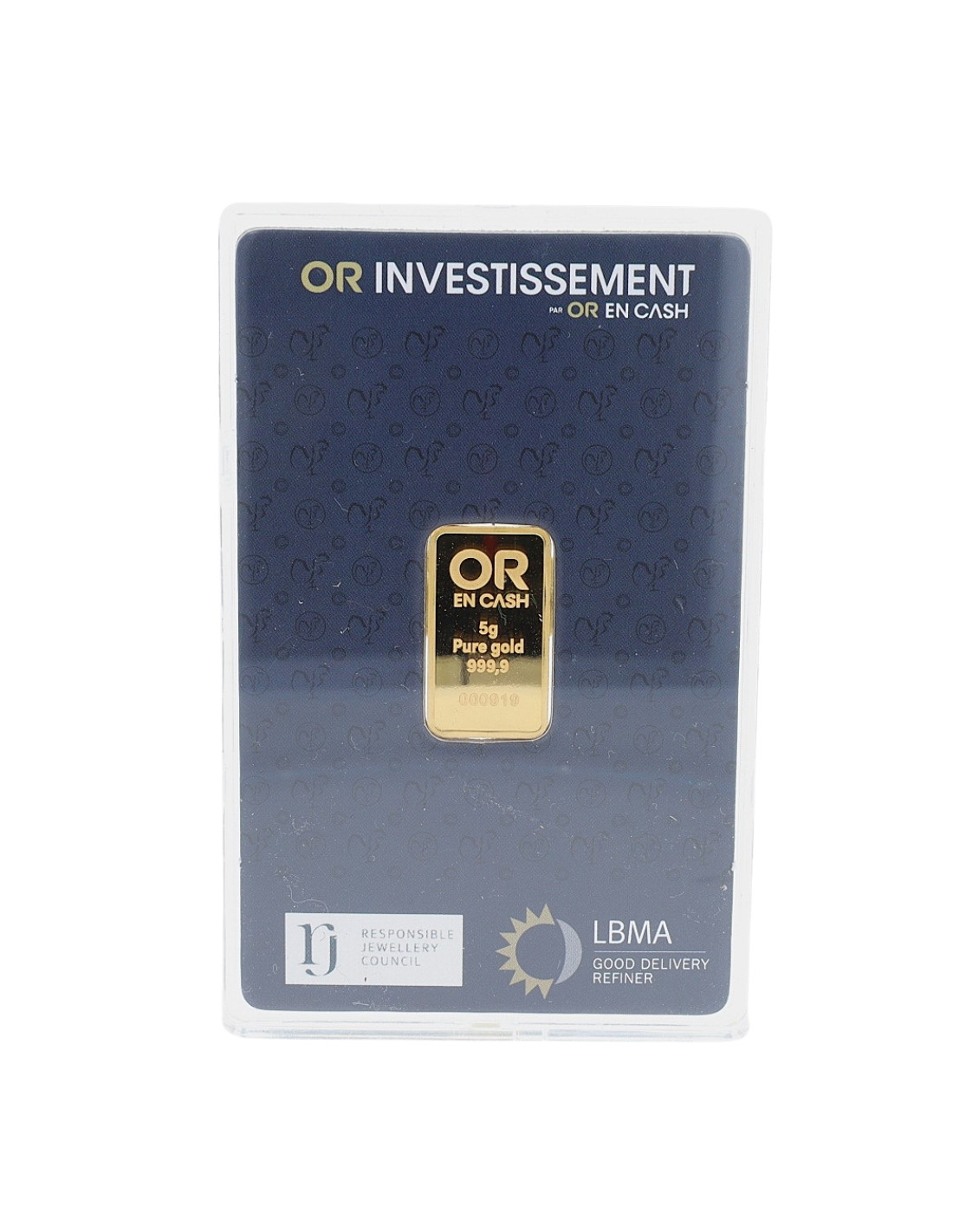 Ce lingotin d'or d'un poids de 5 grammes, facile à stocker, est vendu numéroté et conditionné sous blister plastique. Ce lingot est gravé avec une finition polie haute qualité, ce lingot mesure 17,82 x 10,82 x 0,674 mm, il est marqué Or en Cash. Le scellé comportant la certification LBMA sera accompagné d'une facture comportant le numéro du lingot. Ces éléments sont essentiels si vous souhaitez investir dans l'or d'investissement, afin de pouvoir garantir la provenance de votre lingot or 5 grammes et de pouvoir bénéficier, le cas échéant, de la défiscalisation partielle ou totale lors de votre revente.