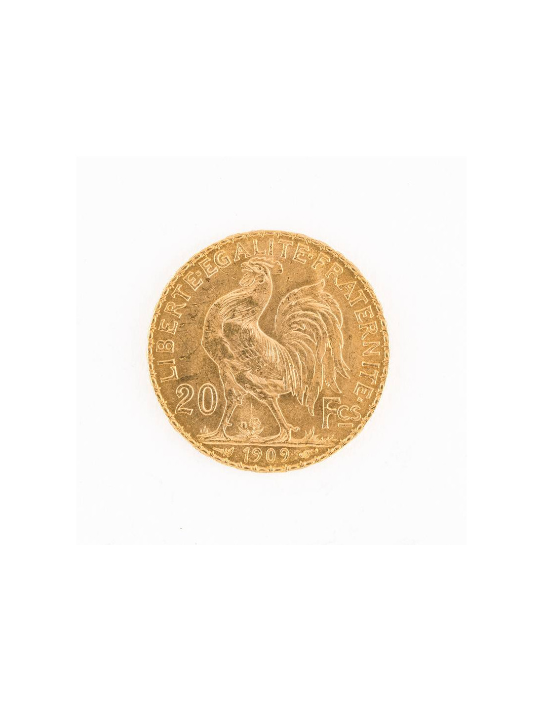 La valeur faciale de la pièce en or 20 Francs Marianne Coq est également présente, ainsi que son millésime.