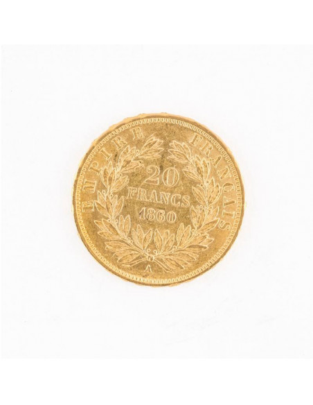 Nous observons, sur l'avers, l'effigie de l'empereur Napoléon III, tête nue. Sur le revers: Une couronne de lauriers en arc de cercle entourant la valeur faciale de la pièce 20 Francs ainsi que son millésime. L'inscription « Empire Français » est gravée autour de cette couronne.