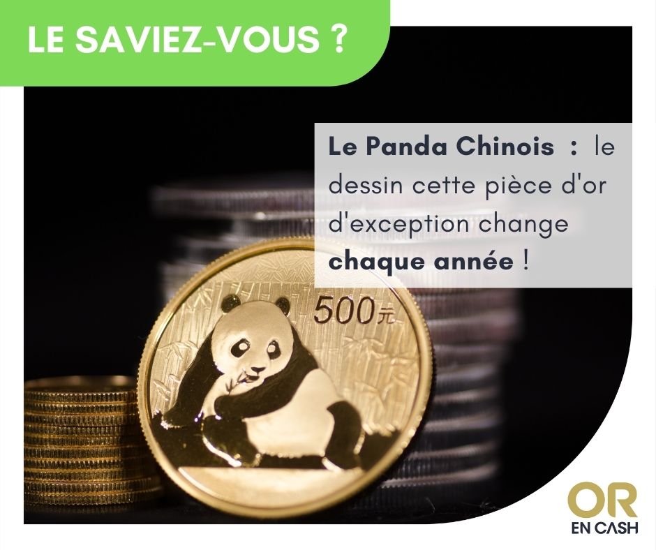Les pièces d’or Panda Chinois, ont cours légal en Chine, et sont très prisées des investisseurs ainsi que des collectionneurs. Comme toute pièce d'or d'investissement reconnue, elle permet d’investir son épargne dans l’or, tout en permettant à l'acquéreur de profiter d'une prime à la revente. Certaines pièces, en fonction des années, sont en effet très prisées.