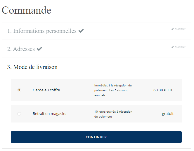 - Renseignez les champs “1. Informations personnelles et “2. Adresse” puis rendez-vous dans la partie “3. mode de livraison ». C'est ici que vous trouverez l'option « Garde au coffre ». Il vous suffit simplement de cocher la case « Garde au coffre » pour souscrire à l'offre.